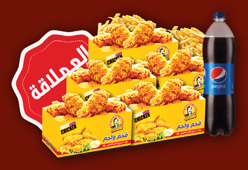 عدد 24 قطعة دجاج بروستد عدد 8 سلطة كولسلو 100غم عدد 2 بطاطا كبير عدد 13 مثومة 50م + كاتشاب عدد 1 بيبسي 2 لتر عدد 10 خبز